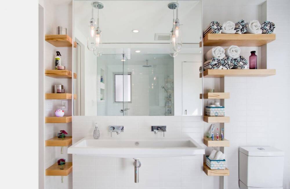 Чтобы в ванной было максимально много места, выбирайте полки, на которых можно спрятать много вещей. Вы можете выбрать умывальник, под который можно поставить полочку для моющих средств. Перед покупкой убедитесь в том, что в ваших шкафах с внутренней стороны дверцы есть небольшие полочки, на которые вы можете положить различные предметы, которые не нужны каждый день в ванной, например, игрушки для купания вашего ребенка. Вы также можете приобрести металлические полки, которые можно повесить на стену. Туда можно убрать аксессуары для волос и косметику.