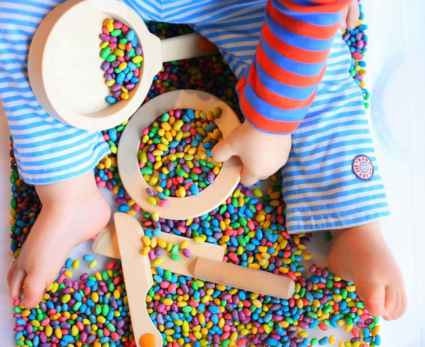 - Смешайте с фасолью другие мелкие предметы (например, крупные бусины или шарики), а затем попросите малыша найти эти предметы среди фасоли, достать их и положить в отдельную емкость.