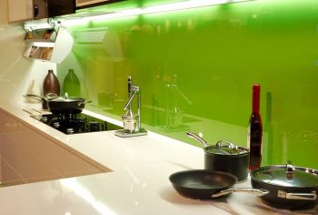 - Применение стекла для отделки стен на кухне придает этому помещению легкость и прозрачность. Для этих целей используется закаленное стекло, толщина которого может быть от 8 мм до 10 мм. Поэтому, беспокоиться, что его можно легко повредить не стоит. Идеально гладкая поверхность этого материала поддерживает чистоту и гигиену на кухне. Стекло бывает разных цветов, что позволяет его подобрать к общему дизайну кухни. Монтаж стекла происходит путем приклеивания его непосредственно на стену.