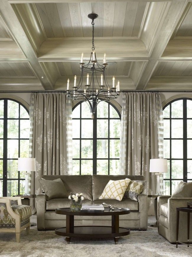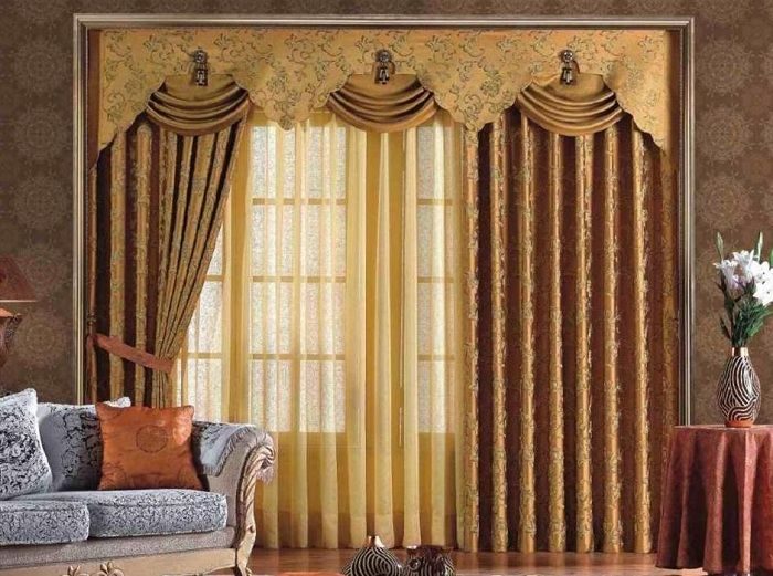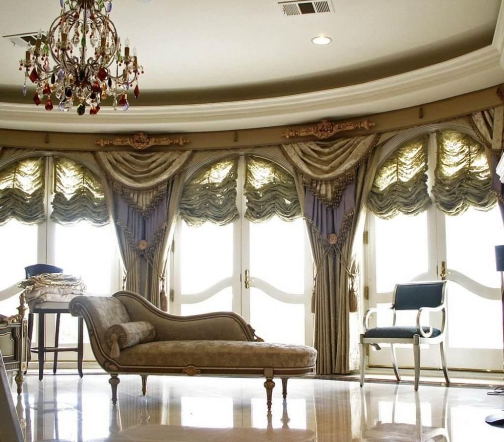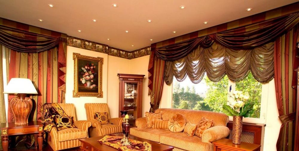 Стиль гостиной — ключевой фактор при выборе фасона штор. Все интерьеры классической направленности — ампир, барокко, модерн, викторианский стиль и прованс, обустраиваются в духе богатства и роскоши, в них уместны портьеры с выразительной драпировкой, украшенные ламбрекенами, подхватами и кистями.