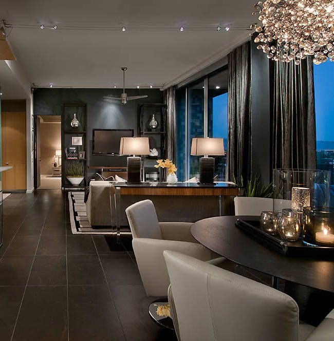 Просторные гостиные — пространство для экспериментов. При правильном сочетании с обстановкой интерьера в них уместны любые решения — роскошные императорские занавесы, французские, итальянские либо японские шторы-панели. Цветов занавесов — любой, вплоть до насыщенных темных тонов — бордового, изумрудного, кофейного.