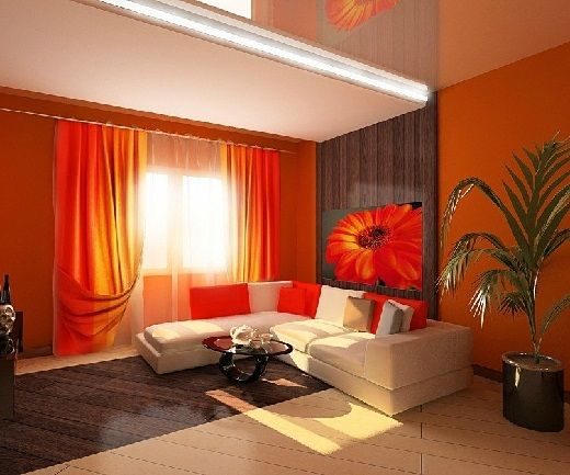 Оранжевые шторы подходят гостиной и столовой. Свежо и стильно смотрятся терракотовые тона.