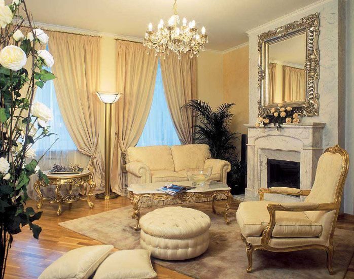 Оформляя зал в духе классики используйте массивные императорские шторы, французские занавесы, «рукав епископа» либо многослойные портьеры, дополненные белоснежной тюлью.