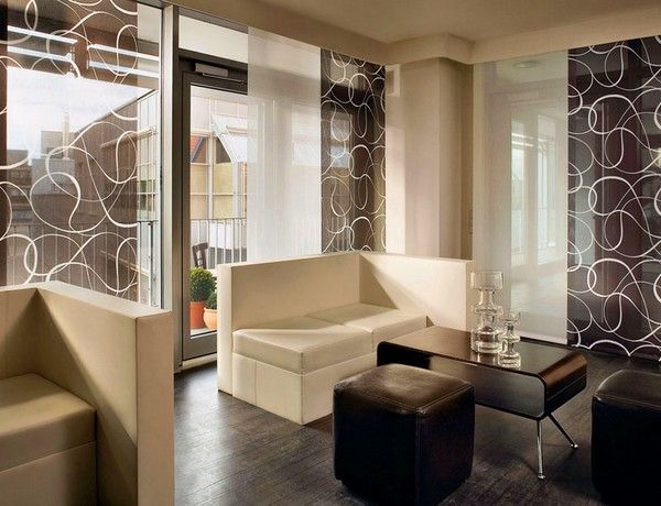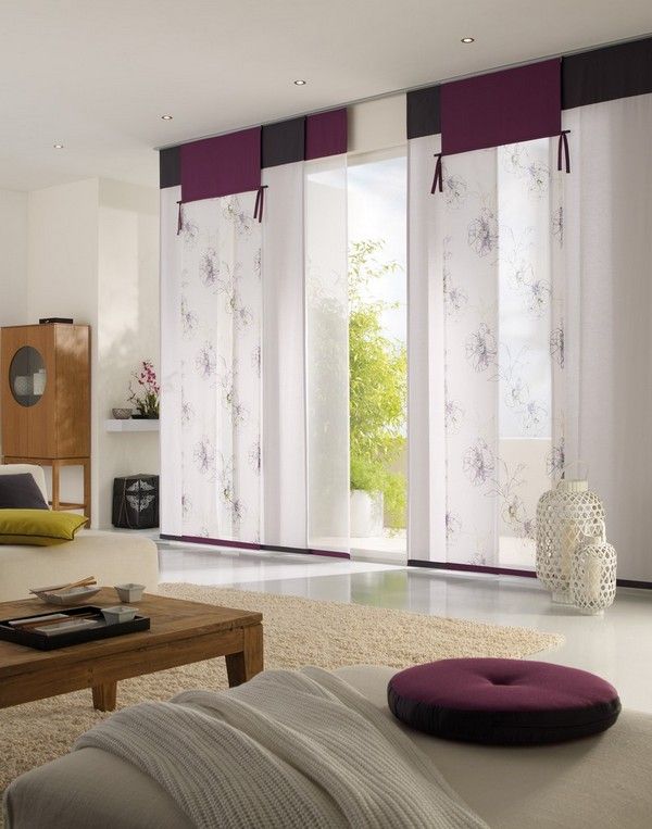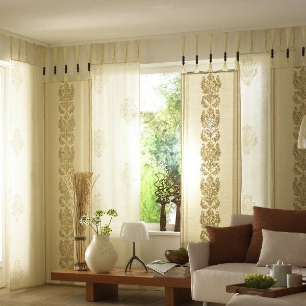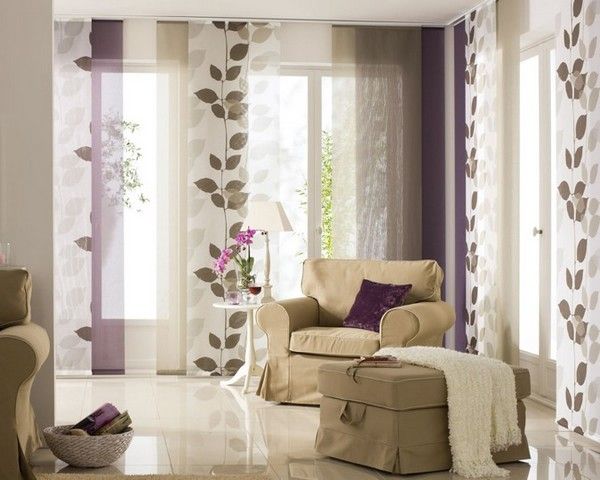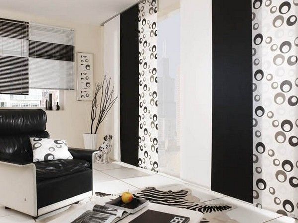Отличный вариант организовать интерьер гостиной в японском или в минималистическом стиле. Японские шторы – длинные полотна полупрозрачной ткани, которые фиксируются вверху по направляющей, а внизу утяжеляются грузом. Если оконный проем большой, то используют несколько полотен таких штор, и в итоге их можно задвигать одну за другую, регулируя количество света, которое попадает в комнату. На таких шторах используются совершенно любые рисунки и орнаменты. Японские шторы не только вносят изюминку в интерьер, но еще и не загромождают пространство, а также позволяют создать уютную и комфортную обстановку, регулируя количество света, которое проникает в квартиру.