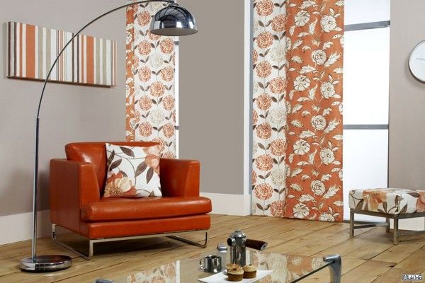 Оранжевые шторы подходят гостиной и столовой. Свежо и стильно смотрятся терракотовые тона.