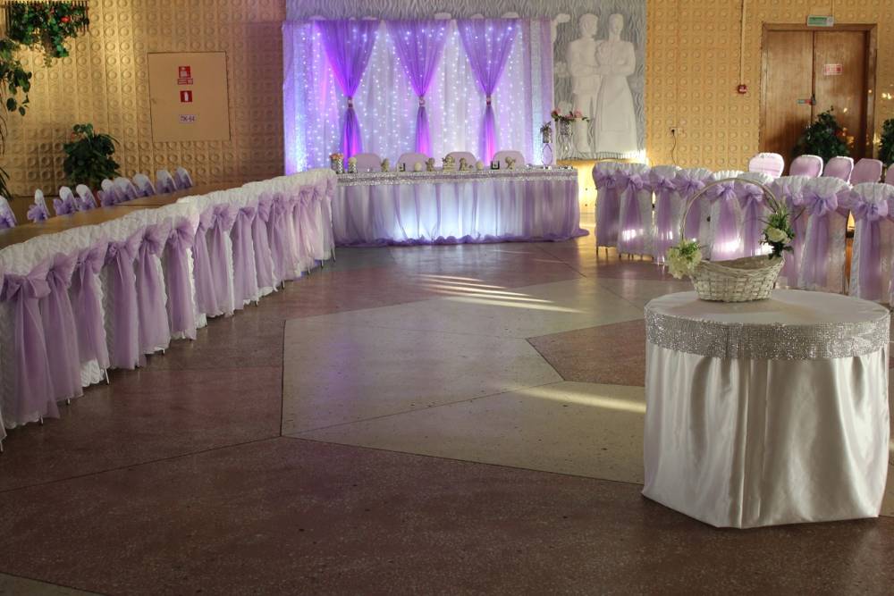 Можно просто арендовать небольшой банкетный зал. Особого труда, чтобы украсить такое помещение — не нужно. С этим можно справиться самостоятельно. Элементарно: цветы на столах, красиво оформленная арка за женихом и невестой, милые декоративные мелочи и натянутые шифоновые ленты — просто, стильно и со вкусом.