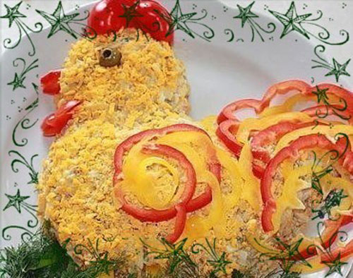 Традиционно к Новому году в нашей стране уже много десятилетий хозяйки готовили салат оливье и селедку под шубой. Если вы сторонник традиционных блюд, приготовьте их. Но для изобретательного Петуха можно поступиться чем-то и изменить рецепт.