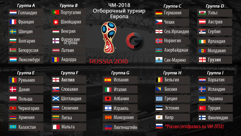 Основу финального тура составят Европейские сборные. С помощью жеребьевки 52 команды были разбиты на девять групп. В семи из них будет выступать шесть сборных, а в двух группах – по пять. Первый групповой матч стартовал уже 4 сентября прошлого года, а закончится отбор в октябре 2017 года. Победители каждой группы попадут в финал, а из команд, которые займут вторые места будет отобрано восемь самых лучших, которые будут бороться между в ноябре 2017 года. Четыре победителя получат по путевке в Россию.
