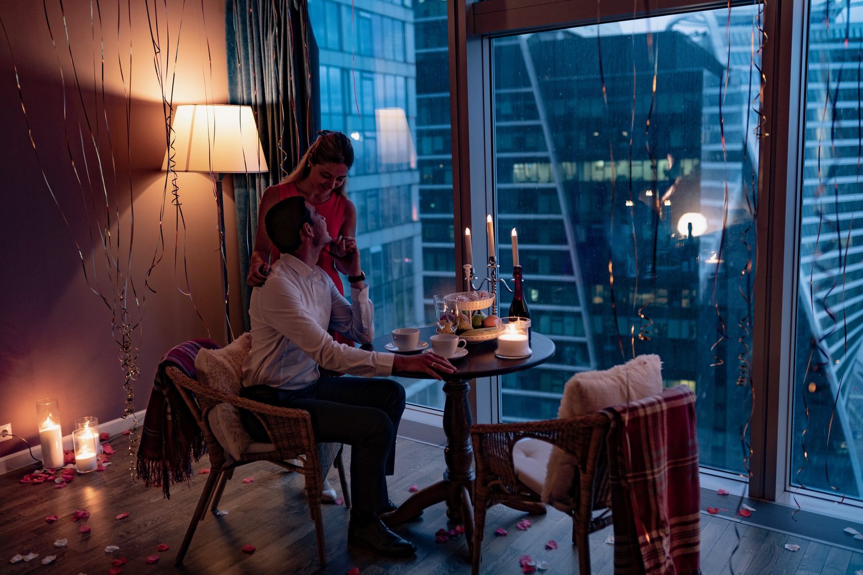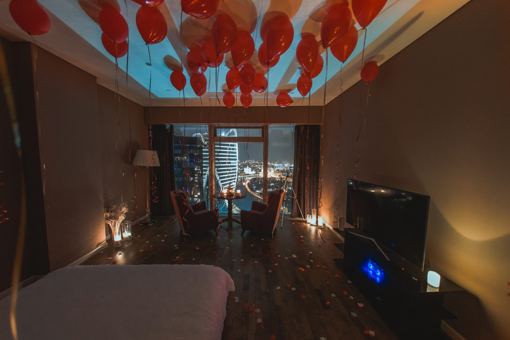 Стоит заплатить весьма умеренную сумму, как пара получает все для комфортной ночи: фруктовую тарелку, шампанское, чай, конфеты раффаэлло. Гарантируется дополнительное украшение воздушными шарами, свечами и гирляндами. И обязательно в фиксированную цену входит фотосессия, на заднем плане которой будет иметься вечерняя Москва.